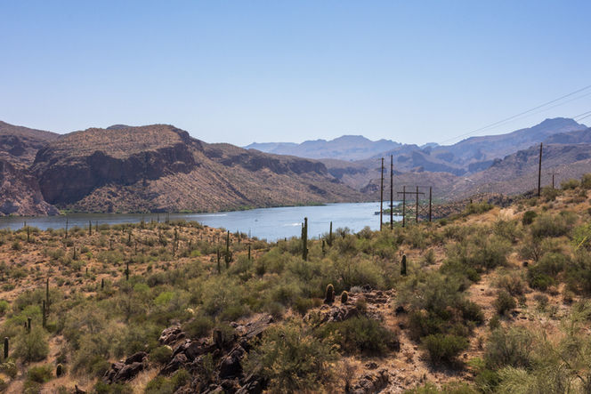Die Straße führte uns durch eine atemberaubende Landschaft, in der rechts und links zahlreiche Kakteenarten wuchsen, darunter die beeindruckenden Saguaro-Kakteen, die bis zu 20 Meter hoch werden. Nach einigen Kilometern schlängelte sich die Straße in zahlreichen Kurven in die Berge, und wir erreichten den Aussichtspunkt Canyon Lake Vista, von dem aus wir auf den gleichnamigen Stausee blicken konnten. Die insgesamt vier Stauseen – der Apache Lake, Canyon Lake, Saguaro Lake und Roosevelt Lake – wurden durch Staudämme am Salt River geschaffen und dienen heute der Wasserversorgung sowie der Energiegewinnung für die Region.